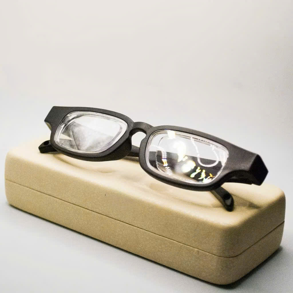 Kính lão điều chỉnh tiêu cự dùng công nghệ thấu kính trượt, là 2 lớp thấu kính chiết suất siêu cao trượt lên nhau.